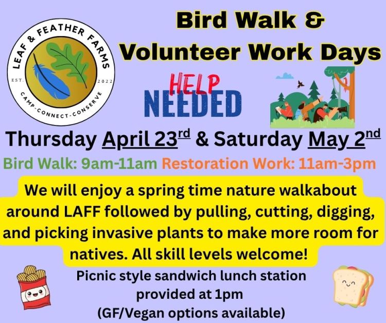 Spring has sprung! And we could use some help to make a greater impact on our restoration work. Two options to come out and lend a hand: Thursday April 23rd and Saturday May 2nd 2026. We will have some safety equipment and tools available, but if you are thinking of joining us and can bring your own work gloves, eye protection, clippers, etc. please do! Refreshments will be provided as an additional thank you for your efforts